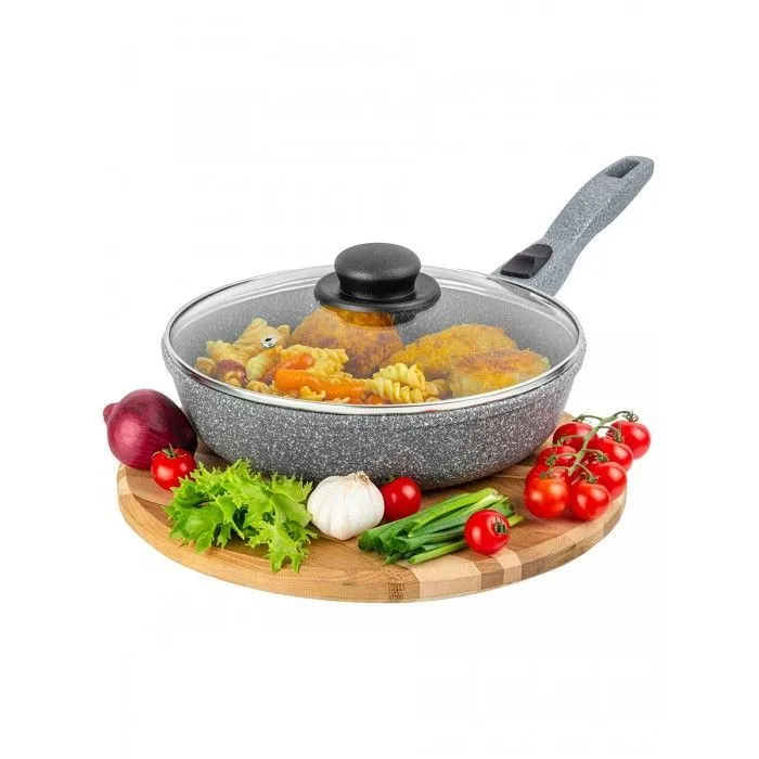 Сковорода глубокая 24 см ГАРМОНИЯ ВКУСА "Серый мрамор", съемная ручка, с крышкой, ручка - 20 см, покрытие - 2-х слойное антипригарное (PFLUON серии CO