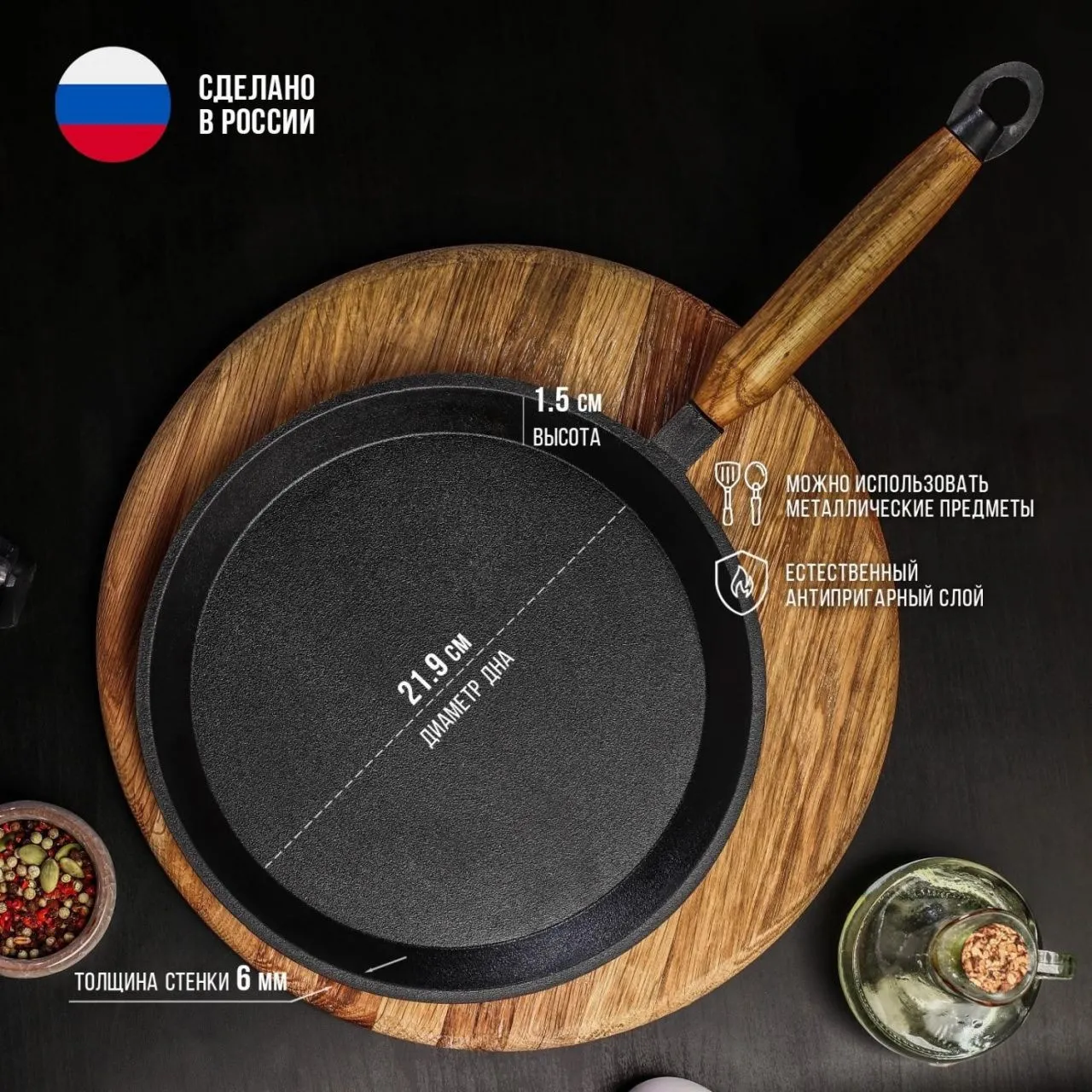 Сковорода блинная 22 см "Magma" литая чугунная, дерев. ручка 9129532