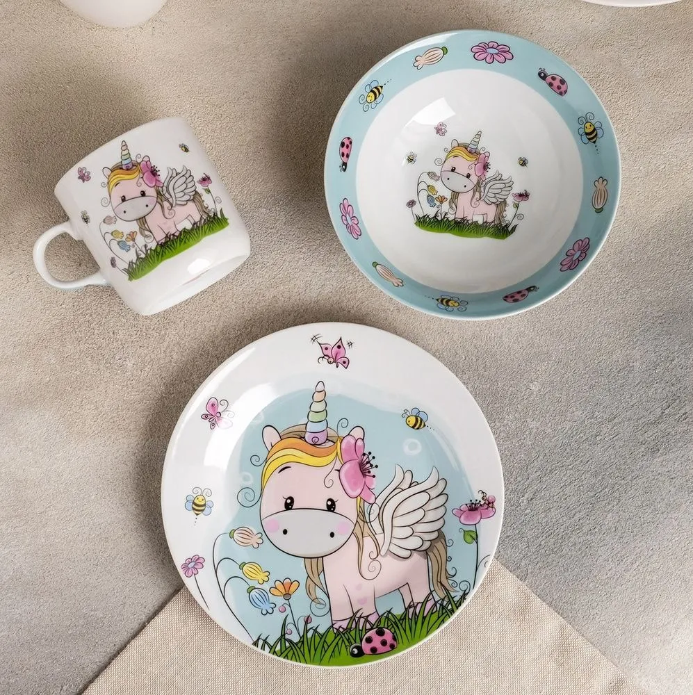 Набор детской посуды 3 предмета "Единорожка" кружка 250 мл, миска 400 мл, тарелка 18 см 3850492
