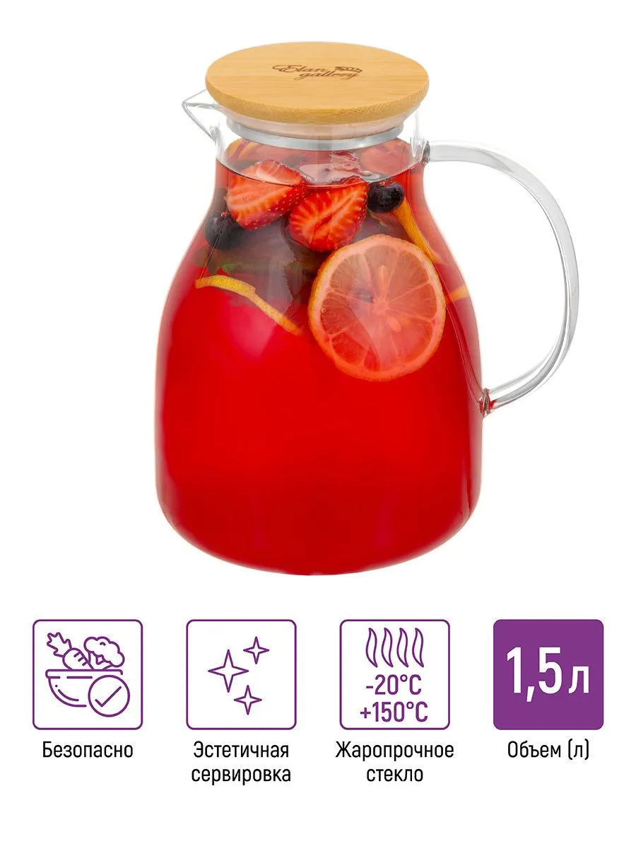 Кувшин "Crystal glass" 17,5*13,5*19,3 см, 1,5 л, с бамбуковой крышкой, имеющей металлическое дно и силиконовую прокладку, высота без крышки - 19,5 см,
