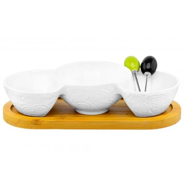 Менажница "Розы" 22*9,5*5,8 см, цельная, глубокая, 3 секции, 2 секции - 70 мл - каждая, 1 секция - 150 мл, с 2 шпажками, на деревянной подставке