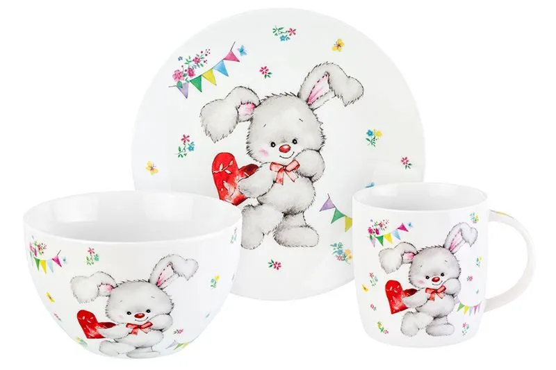 Набор 3 предмета "Зайка с сердцем", 11,8*8,5*9 см 350 мл - кружка, 13,5*13,5*8,5 см 700 мл - миска (салатник), 19*19*2 см - тарелка, фарфор