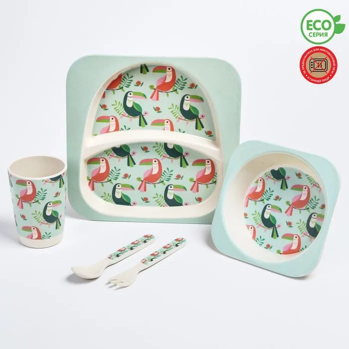 Набор бамбуковой посуды "Тукан", тарелка, миска, стакан, приборы, 5 предметов 4482564