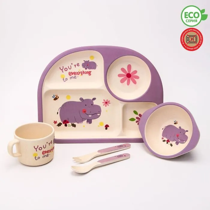 Набор бамбуковой посуды "Бегемотик", тарелка, миска, стакан, приборы, 5 предметов 4167337