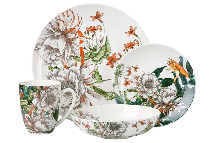 Набор обеденный 16 пр "Тропические цветы" (4 об.тарелки 27.5см,4 закус.тарелки 19см,4 салатника 18.5см,4 кружки 0.42л) в подар.упаковке.