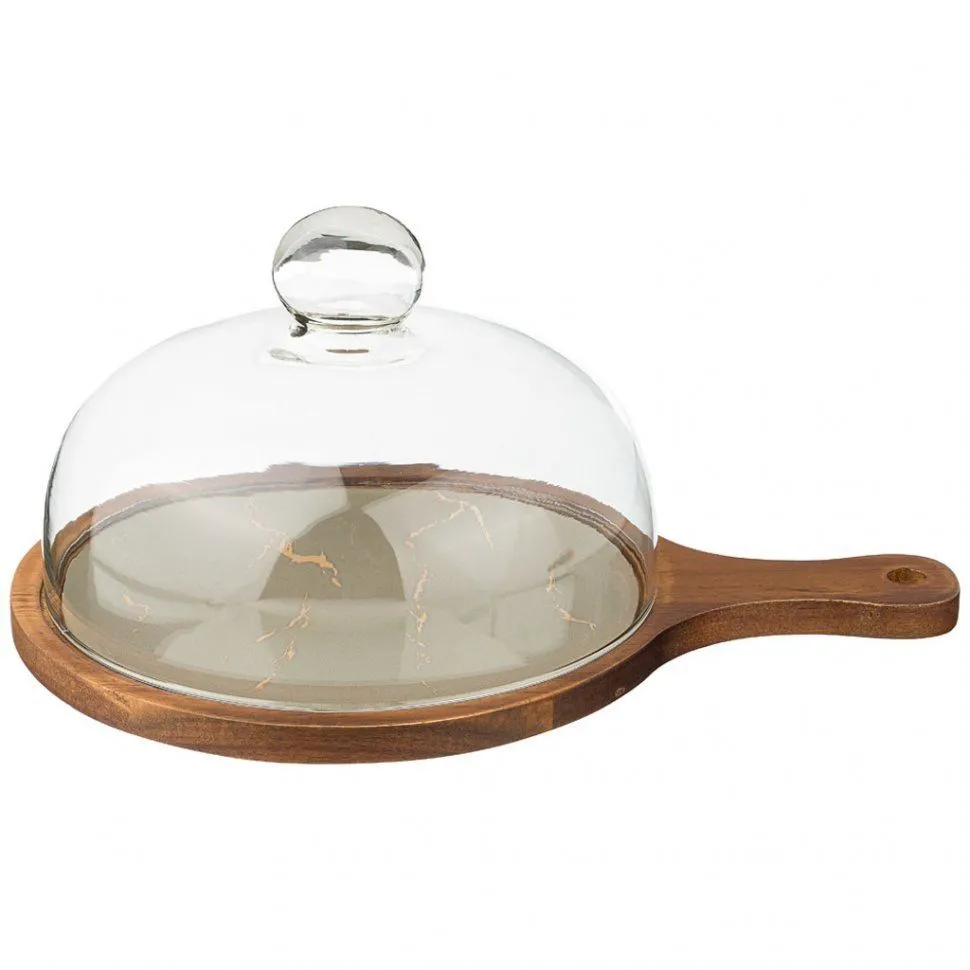БЛЮДО НА ДЕРЕВЯННОЙ ПОДСТАВКЕ С КРЫШКОЙ КОЛЛЕКЦИЯ "ЗОЛОТОЙ МРАМОР" ЦВЕТ: GRAY 32.5*23.5*14 СМ412-162