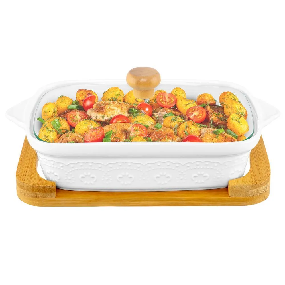 Блюдо для запекания и сервировки "Белый узор" 30*18*13 см 1,1 л, прямоугольное, с ручками, со стеклянной крышкой с деревянной ручкой, на деревянной п