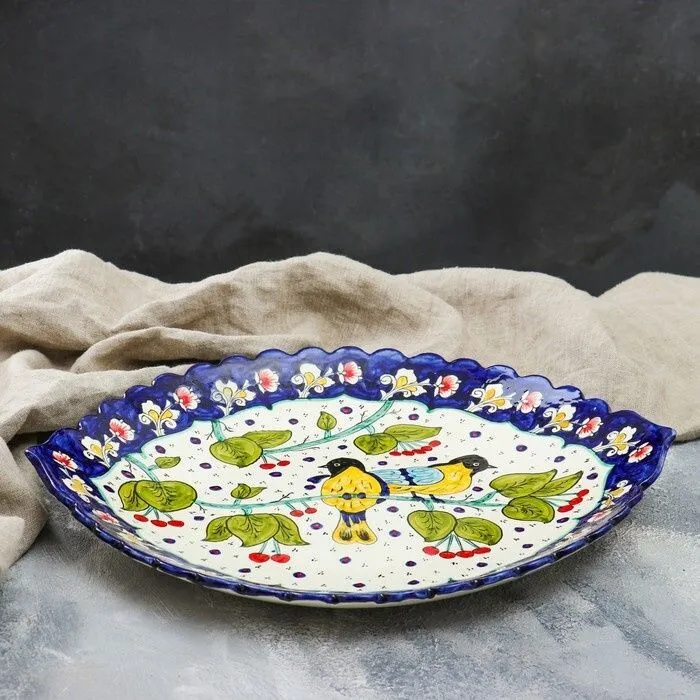 Ляган Риштанская Керамика "Пара птичек", овальный, рифлёный 41 см 1924279