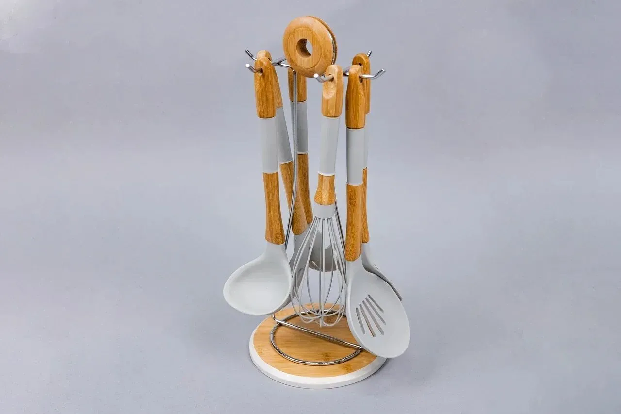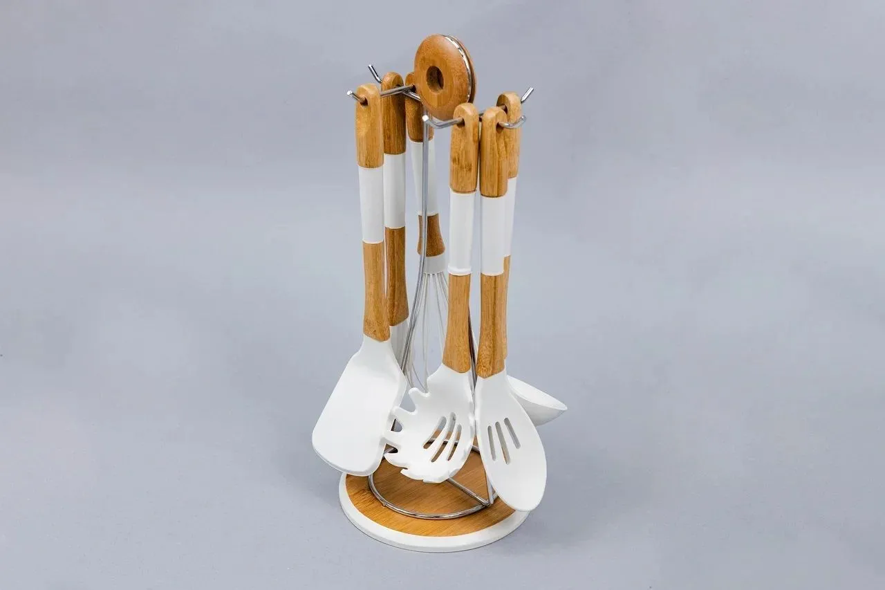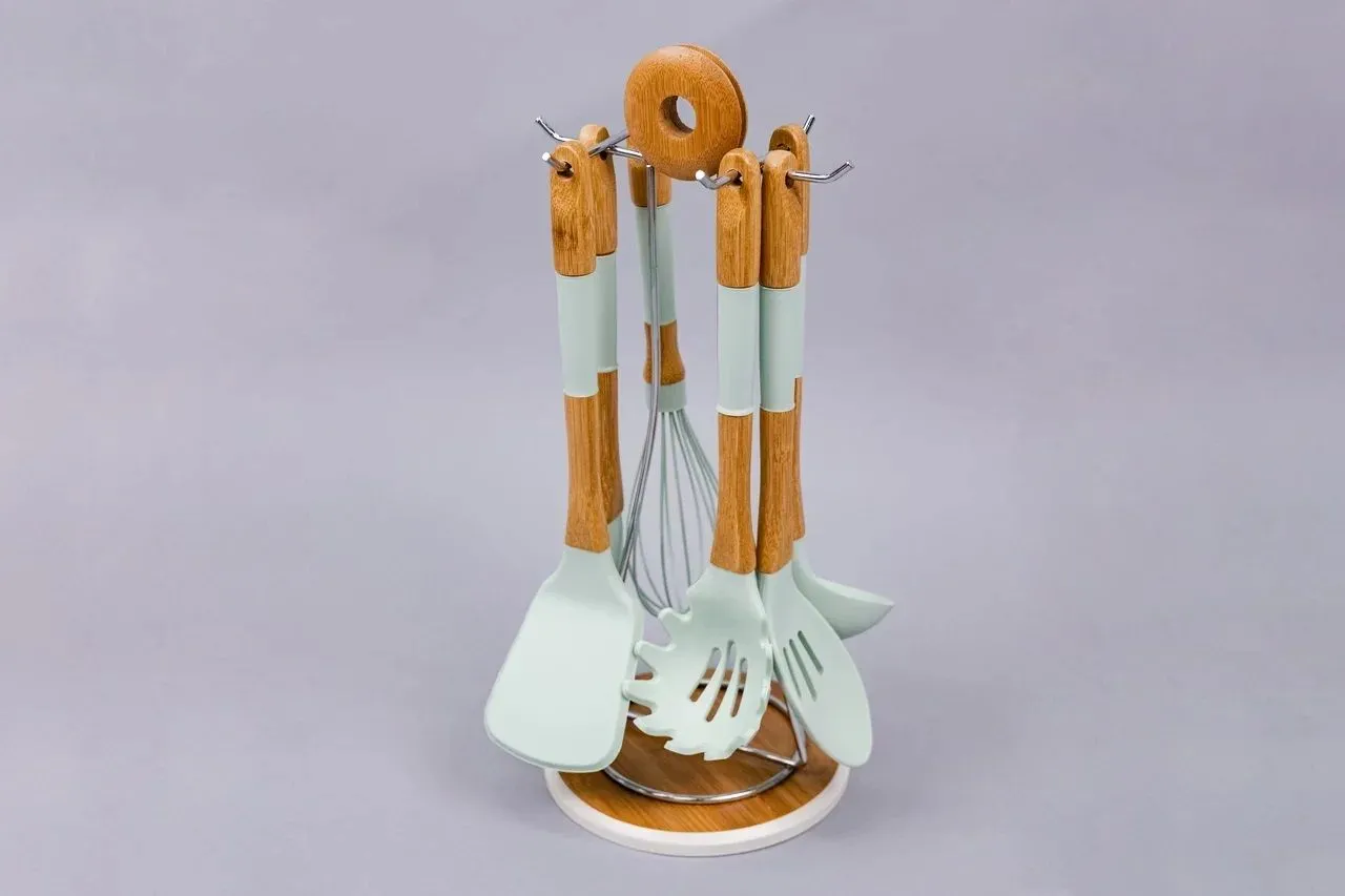 Набор из 6 кухонных принадлежностей из бамбука/силикона на бамбуковой подставке SK-8068