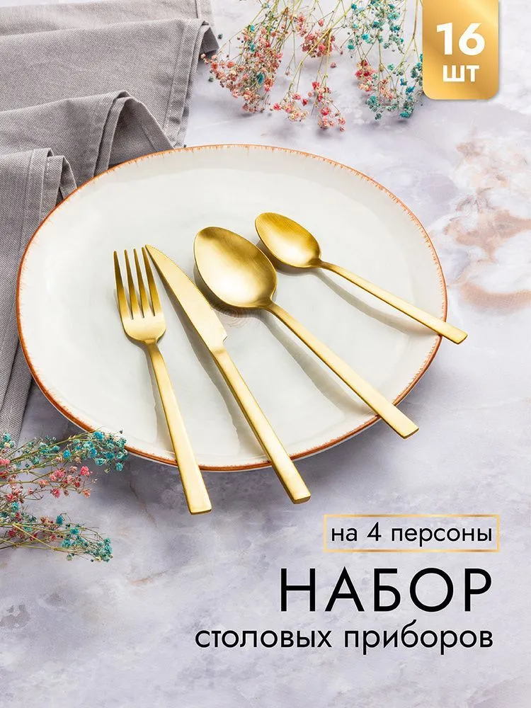 Набор столовых приборов 16 предметов, золото - ножи 4 шт. 23,3*1,7*0,5 см - каждый, вилки 4 шт. 20,5*2,6*2,5 см - каждая, ложки 4 шт. 20,5*4,4*2,2 см