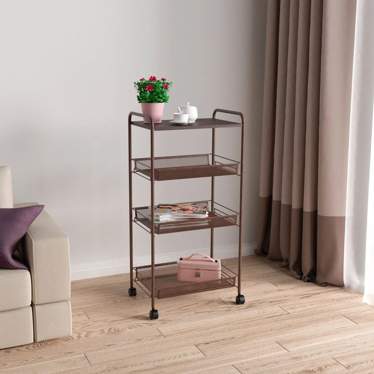 Этажерка "Ладья 34КС" со столиком под дерево (LADYA 34KC storage cart, wood table) (Металлик)
