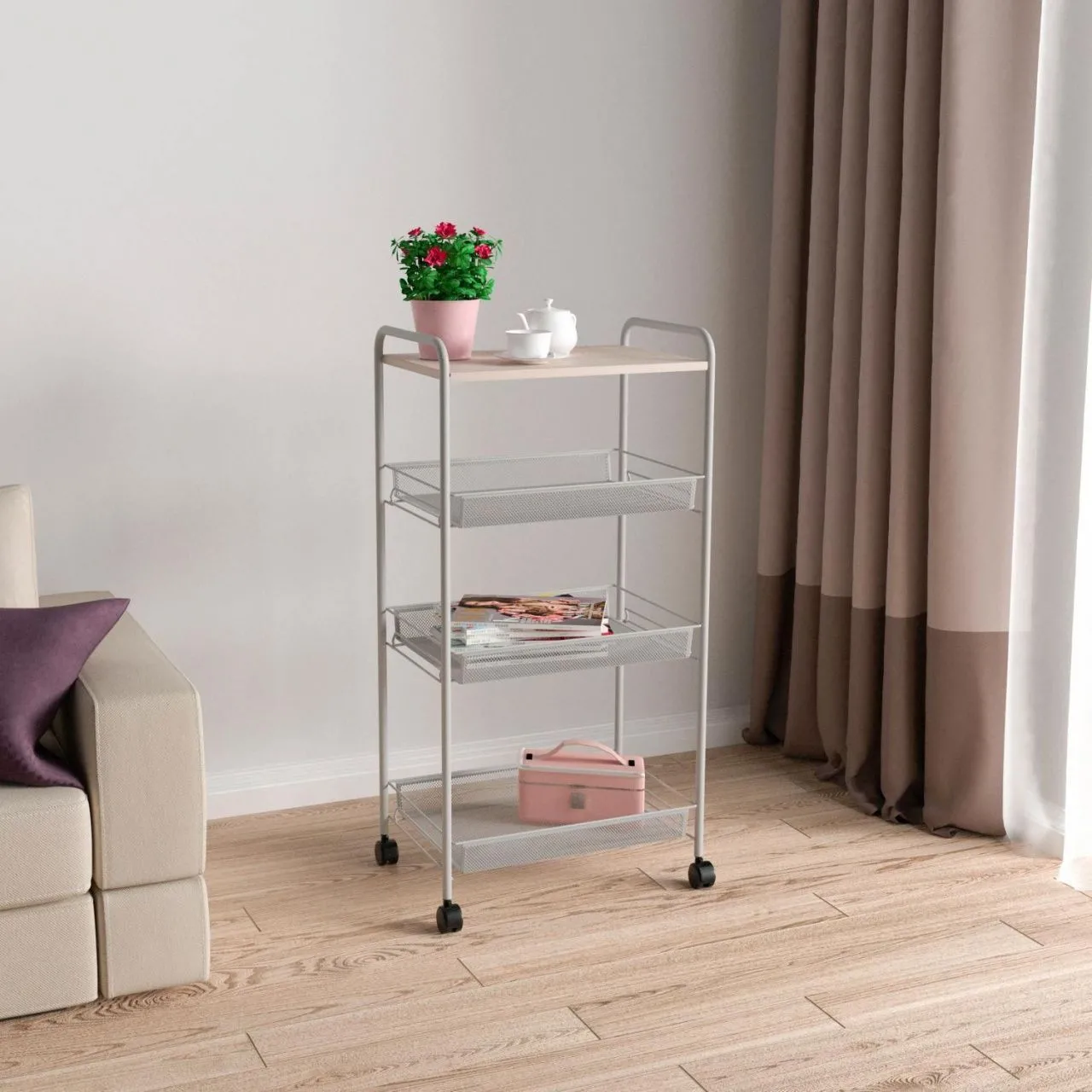 Этажерка "Ладья 34КС" со столиком под дерево (LADYA 34KC storage cart, wood table) (Серый)