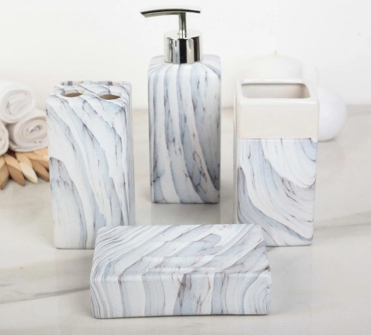 #Набор для ванной "Мрамор" 4 предмета: мыльница, дозатор для мыла, 2 стакана, прямоугольник