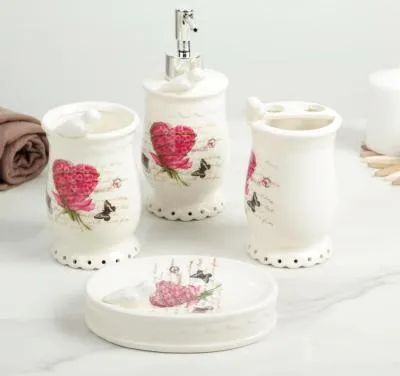 Набор для ванной 4 предмета "Цветочки" белый, мыльница - 13*9,5*2,3 см., дозатор для мыла - 8*8*18,7 см. 330 мл.(высота без дозатора -13 см.), подстав
