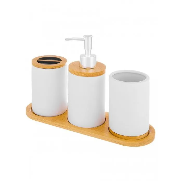Набор для ванной 3 предмета "Белый с хромом" на деревянной подставке, дозатор - 7,6*7,6*18 см 350 мл, (высота без дозатора - 12 см), держатель щеток -