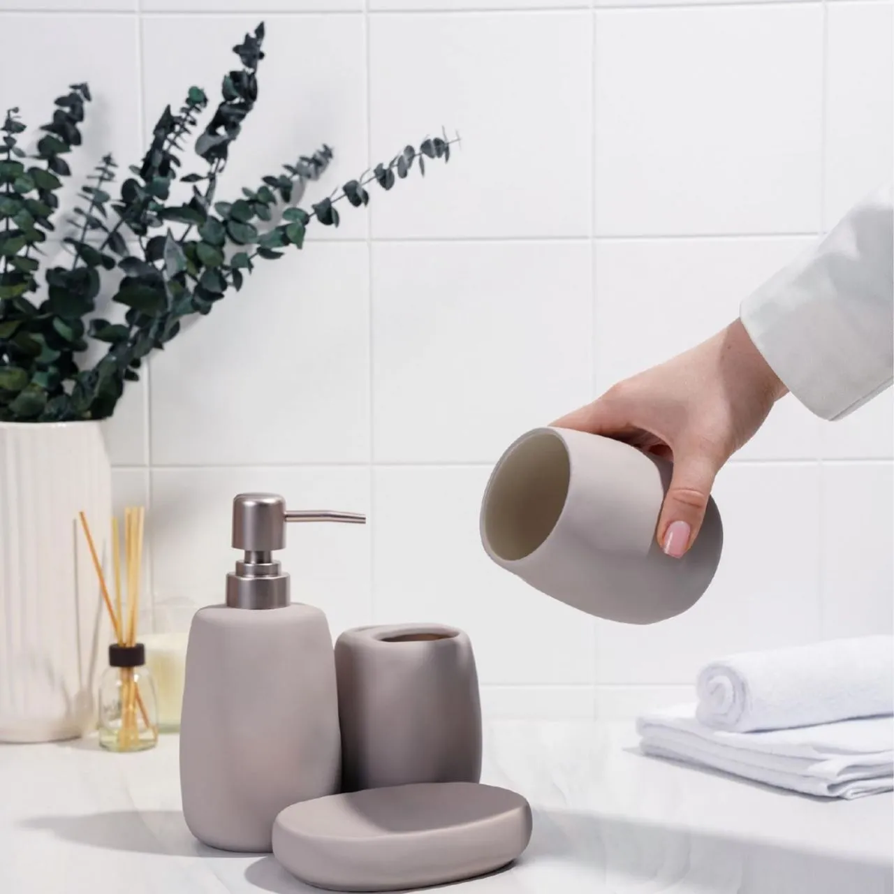 Набор для ванной Soft, 4 предмета (мыльница, дозатор для мыла, 2 стакана), цвет бежевый 7514800