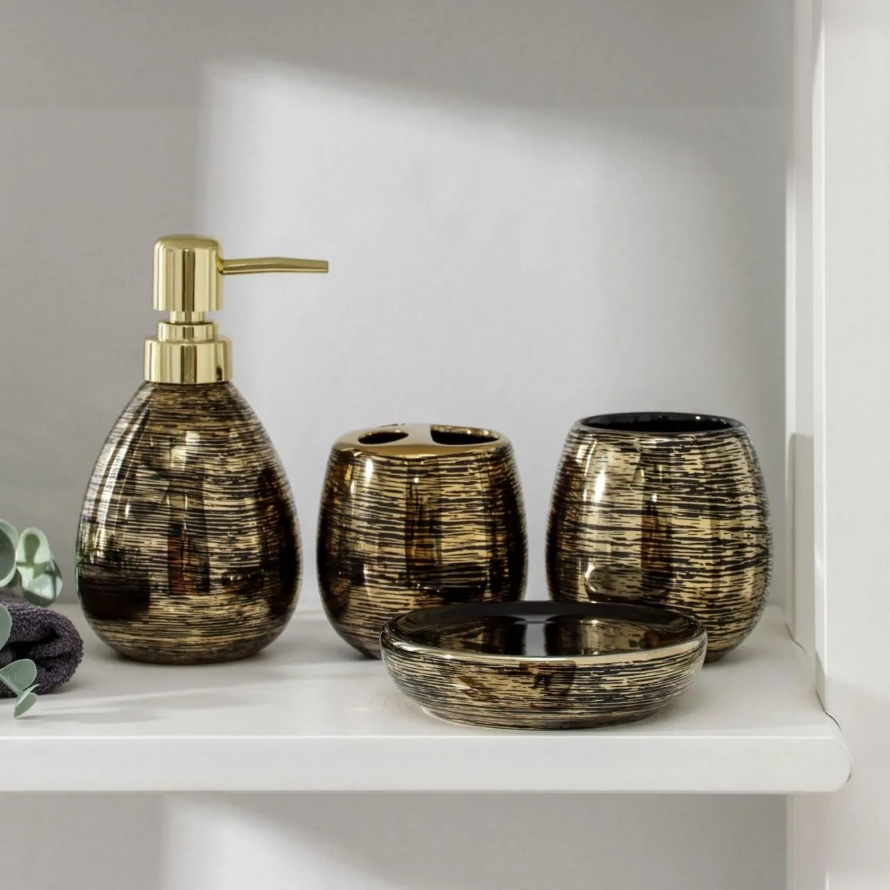 Набор для ванной "Нити" 4 предмета (мыльница, дозатор 400мл, 2 стакана), цвет золото 7067993
