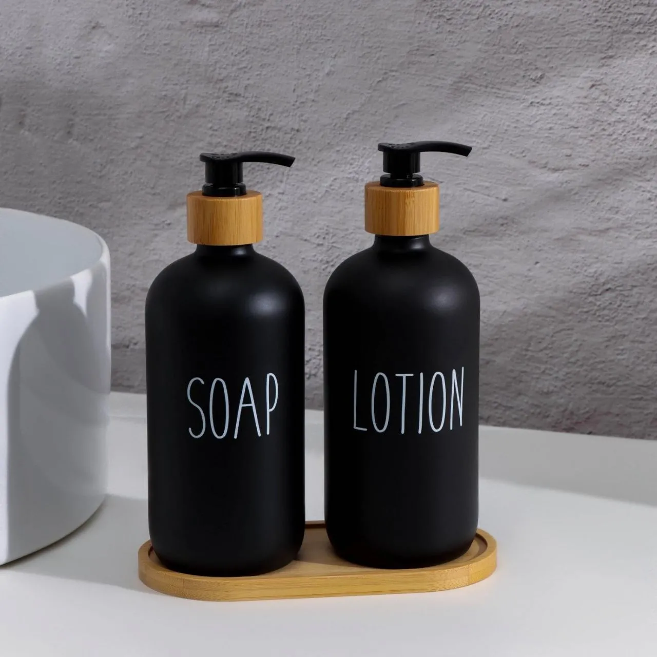 #Набор дозаторов для ванной на подносе из бамбука, по 500 мл, стекло 9492943